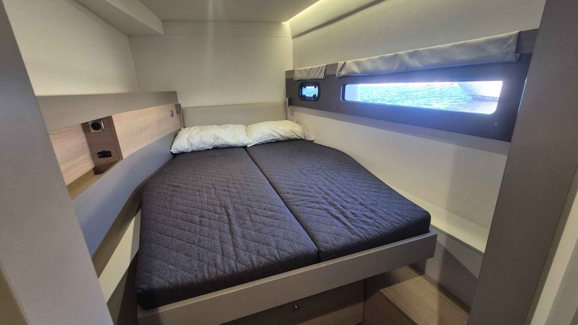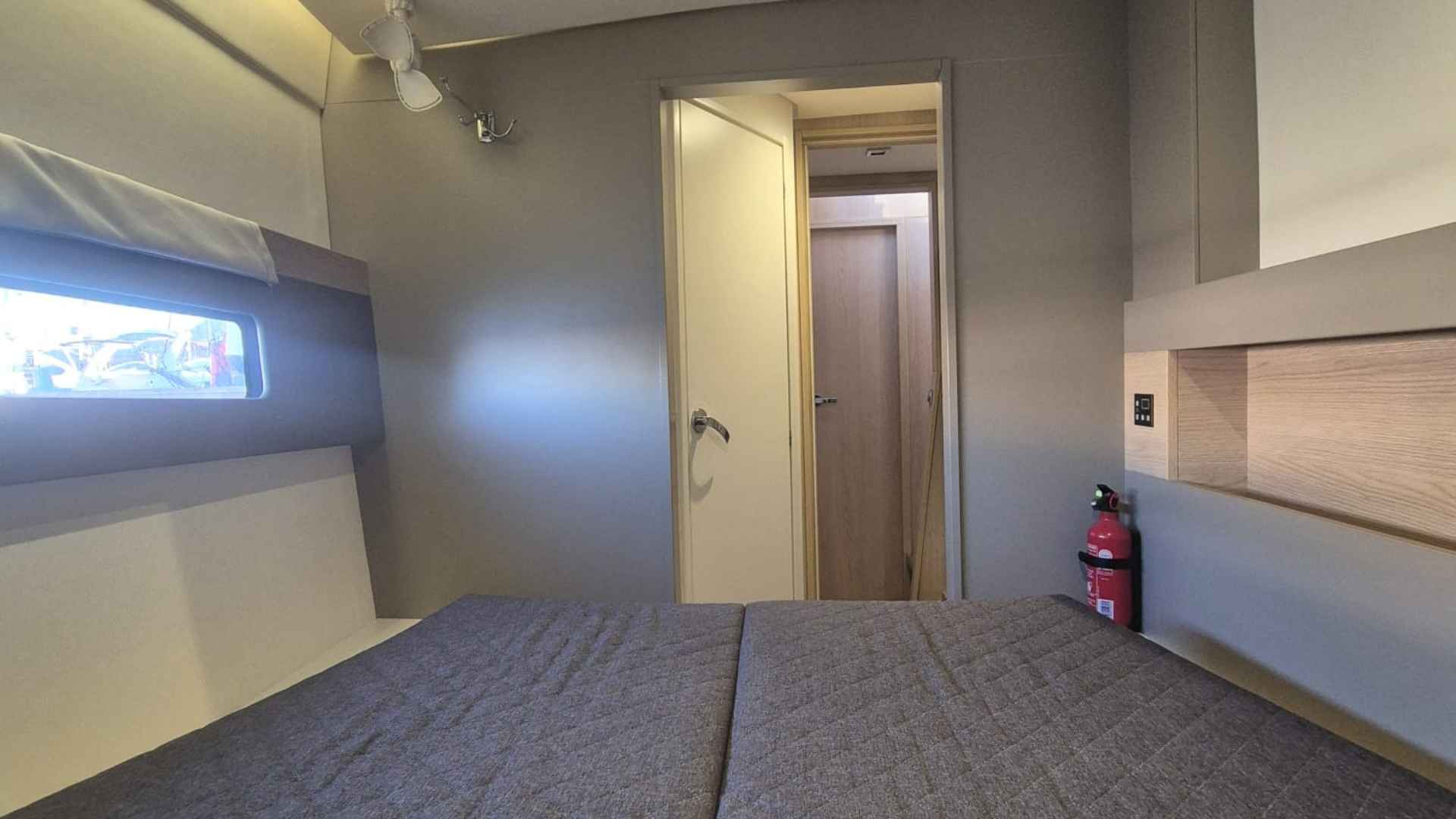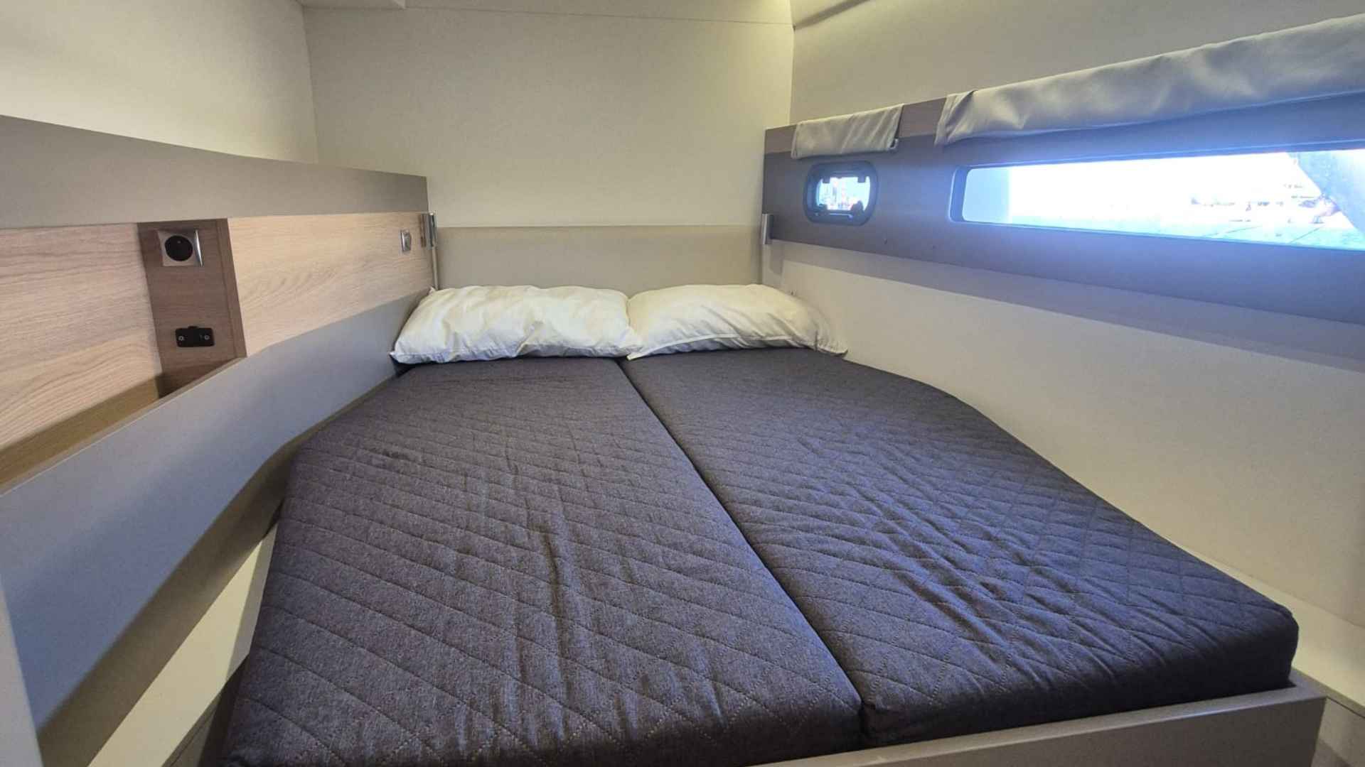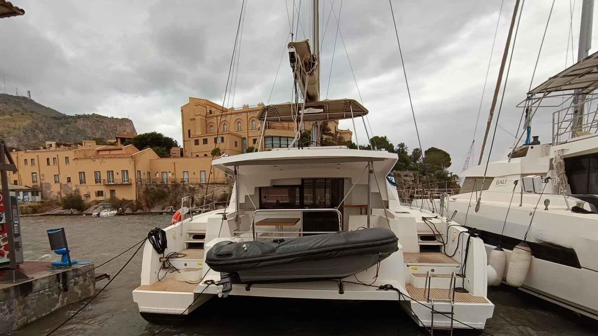 Bali 4.5 for sale 2019 | 4 Guest Cabins + 1 Crew Cabin | Tax Not PaidIf you are searching for a catamaran combining performance, comfort and modern design, the Bali 4.5 for sale 2019 is an interesting option. Built by Catana Group and designed by Xavier Fay.Principal SpecificationsBuilder: Catana GroupModel: Bali 4.5Designer: Xavier FayFlag: ItalianYear Built: 2019DimensionsLength: 13.60mBeam: 7.42mDraft: 1.25mDisplacement: 11,800 kgDeck & CockpitHull Material: GRPHull Colour: WhiteCockpit Teak: Yes, Flexiteek (2025)Cockpit Cushions: YesChine Material: GRPCockpit Table: Yes, woodBimini: YesAccommodation & InteriorDouble Cabins: 4Crew Cabin: 1Bathrooms: 5 (4 guest + 1 crew)Separate Showers: 4Convertible Dinette Table: YesStove: 3 burnersOven: YesRefrigerator: Vertical with freezer and ice makerEngines/PropulsionEngines: 2 x Yanmar, 60hp each (2019)Engine Hours: 1,400 (as of Dec 2025)S-drive TransmissionTank Capacity: 800LFixed Blade PropellersHelm: Wheel steeringElectronics & NavigationAutopilot: YesVHF: YesEcho Sounder: YesLog/Tridata: YesWind Station: YesCompasses: YesStereo: YesPlotters: 2 unitsElectrical & Comfort SystemsVoltage: 12/220VWater Tanks: 2 (Total: 800L, PVC)Bilge Pumps: 6 (4 electric, 2 manual)Heating: YesAir Conditioning: YesBattery Charger: YesBoiler: Yes (for hot water)Water Pump: Yes (autoclave)Black Water System: YesExternal Shower: YesGenerator: 9 kW unitSails & RiggingMast: Deck-steppedWinches: 2Lazy Bag: YesVang: YesFurling Genoa: YesTender & SafetyTender: Highfield 3.10 classic with Yamaha 9.9hp outboardElectric Windlass: YesAnchor & Chain: YesMooring Lines: SuppliedLife Raft: YesFenders: 8Safety Equipment: ComprehensiveThe Bali 4.5 for sale 2019 is well-appointed for comfort under sail or at anchor, with comprehensive navigation and safety features and comfortable living spaces. With her two-ownership history and ongoing maintenance, she represents a solid choice for those seeking a versatile catamaran in good condition. For more details or to arrange a visit, don't hesitate to contact us!