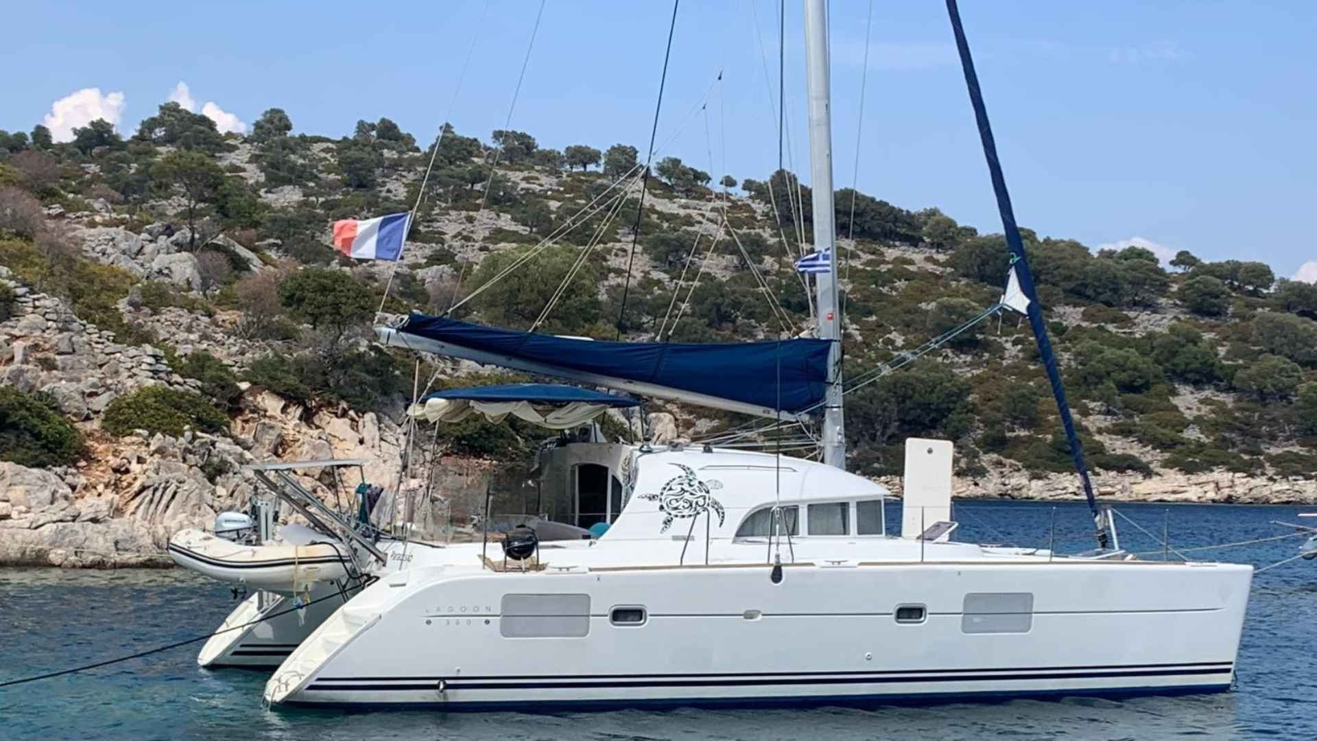 Lagoon 380 S2 for sale 2005 | 4 Guest Cabins | Tax PaidIf you are searching for a comfortable and practical catamaran for cruising with family and friends, this Lagoon 380 S2 for sale 2005 presents a reliable option. Registered under the French flag and with VAT tax paid, she is ready for new adventures. Carefully maintained, this 2005 model is in good condition, offering a thoughtful combination of safety, comfort, and proven seaworthiness.General SpecificationsModel: Lagoon 380 S2 for sale 2005Year built: 2005Length: 11.55 mBeam: 6.53 mDraft: 1.20 mWeight: 6000 kgFlag of registry: FranceTax: PaidAccommodationGuest cabins: 4 double cabinsGuest heads: 2 bathroomsWater tanks: 2 × 500 LCooker: 3 burnersOvenRefrigeratorHot water systemExterior shower headEnginesEngine 1: Volvo Penta D1 30, 30 hp, year 2005, 4400 hoursEngine 2: Volvo Penta D1 30, 30 hp, year 2015, 3300 hoursPropulsion: Sail drive, 3 blade propellersSails and RiggingFully battened mainsailFurling genoa (very good condition)Total sails: 6 (battened, 2 reefs, very good condition)SpeedCruising speed: 8 knotsMaximum speed: 10 knotsElectronics and NavigationRaymarine autopilotRaymarine central instrumentsGPS units (2)Depth sounderLog/SpeedWind speedPlotterCompassVHF radioFM radio/CD playerCockpit speakersLED lightingInterior EquipmentOvenMarine headElectric headRefrigeratorHot water systemElectric and manual bilge pumpsSea water pumpBattery chargerShore power (with charger)Inverter220 V sockets throughoutService batteries: 2 × 185 Ah, 3 × 75 Ah5 ventilation fansExterior EquipmentBimini topLazy bagGangwaySolar panels (2)Swimming ladderDinghy + Honda 5 HP outboard engineLiferaftElectric windlass + mast chairToolsAnchors: 2Mooring lines + fendersCovers: bimini, lazy bagLifejackets for 8 peopleSurvival and safety equipment for 8 peopleThis Lagoon 380 S2 for sale 2005 is ready for inspection and ideal for those seeking a well-equipped catamaran in good condition, with the added reassurance of a fully settled VAT status under the French flag. Contact us now to schedule a viewing or for more information.