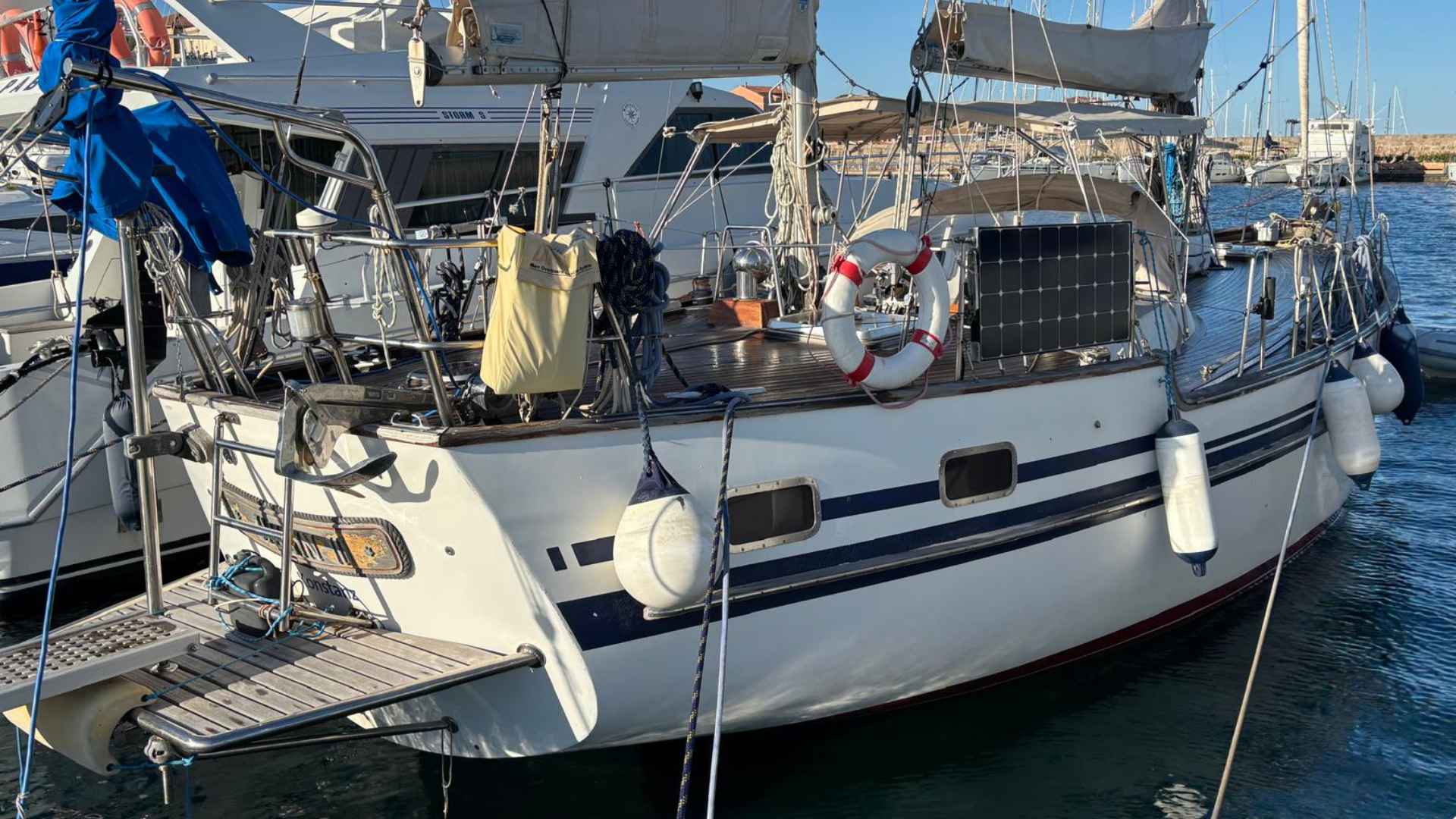 Vindö 90 for sale 1978 | 2 Cabins Version | Tax PaidIf you are searching for a classic sailing yacht with timeless charm and proven sea capabilities, the Vindö 90 for sale 1978 presents a special opportunity. Built in the legendary Nötesunds Varv in Sweden, this ketch-rigged vessel demonstrates the craftsmanship and thoughtful design for which Vindö yachts are renowned. Having been well cared for, including a comprehensive overhaul in 1994/1995, and an ongoing program of renewal and technical upgrades, she remains in good condition and ready for new adventures.(Autopilot, Plotter, Radar, Inverter, Solar Panels, Watermaker, Anchors...)SpecificationsModel: Vindö 90Year Built: 1978Builder: Nötesunds VarvLength Overall: 12.85 mBeam: 3.95 mDraft: 1.85 mKeel: Long keel with 5 t lead ballastDisplacement: Approx. 14 tHull: FiberglassDeck: TeakInterior: MahoganyDeck and ExteriorDeep anchor box, large storage compartmentsCentre cockpit with fixed windscreen and sprayhoodLarge lazarette, stern pulpit with walk-throughBath platform, ladder, stern shower, stainless steel davitsRaymarine windgauge, depth sounder, logSolimar pedestal with Cassens & Plath compass, chartplotter, autopilotRig and SailsSelden mainmast and mizzen (mast steps for ease)Fully battened mainsail (35.3m²), Genoa I (42.5m²)Roller furling jib and additional jib for trade wind sailingMizzen (12.2m²), Parasailor, Spinnaker poleEngine and TanksYanmar 4JH110 engine, 2017, 110hp, approx. 1400 hours600L diesel across three stainless steel tanksInterior and AccommodationOwners’ layout, never charteredStaircase with non-slip stepsForward cabin with berths, electric toilet (2023), illuminated wardrobeSpacious saloon with U-shaped settee and opposite settee, convertible to double berthHigh-quality upholstery (renewed 2019)Pilot berth, navigation station with chart tableL-shaped galley: gimbal-mounted gas stove, double sink, two refrigeratorsAft cabin: two berths (180x200cm), new mattresses, illuminated wardrobeAft head: manual toilet, sink, showerHead locker for foul-weather gear, life jackets, lifebeltsEngine room with technical equipmentWater and Electrical Systems600L freshwater tank, hot water boiler250L blackwater tank220V shore power, charger, inverter, new electrical installation (Philippi panel)Battery bank: 1x140Ah starter (2022), 4x100Ah AGM (2025)Solar panelsNavigation and Safety EquipmentRaymarine electronics: wind, log, depth, radar, chartplotter (C80), AIS, radio, autopilotBfA life raft (servicing required), life jackets, lifebuoy, safety linesFire extinguisher, fire blanketAdditional FeaturesBow thruster (2018), Schenker Smart watermaker, windgenerator, diesel heater, Hydrovane windvane steering, full covers, fenders, bimini, aluminium mast (15m), mast stepsThis Vindö 90 for sale 1978 has benefitted from attentive owners who have maintained her with care, resulting in a yacht that is ready to sail and in good technical and visual condition. For those valuing tradition, quality, and the capacity for long-distance cruising, she represents a rare opportunity on the market. Contact us now, for more information or to book your viewing!